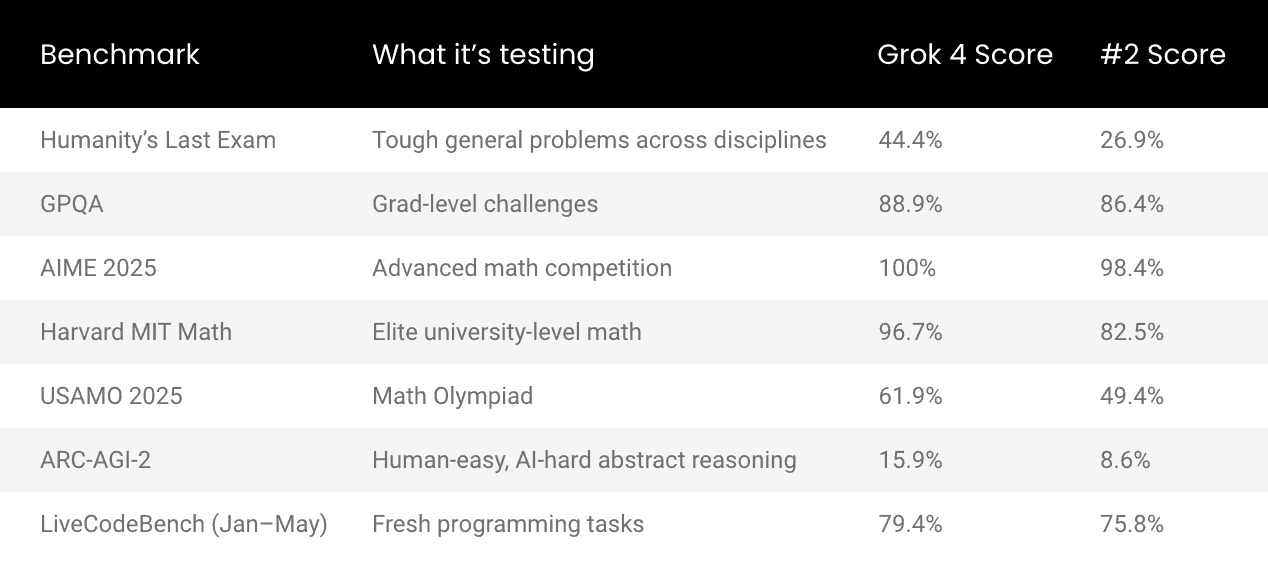 Check the benchmarks: Grok 4 tops the charts in reasoning, math, and coding. It’s been called “PhD-level across every subject.” Certainly X users are taking note.