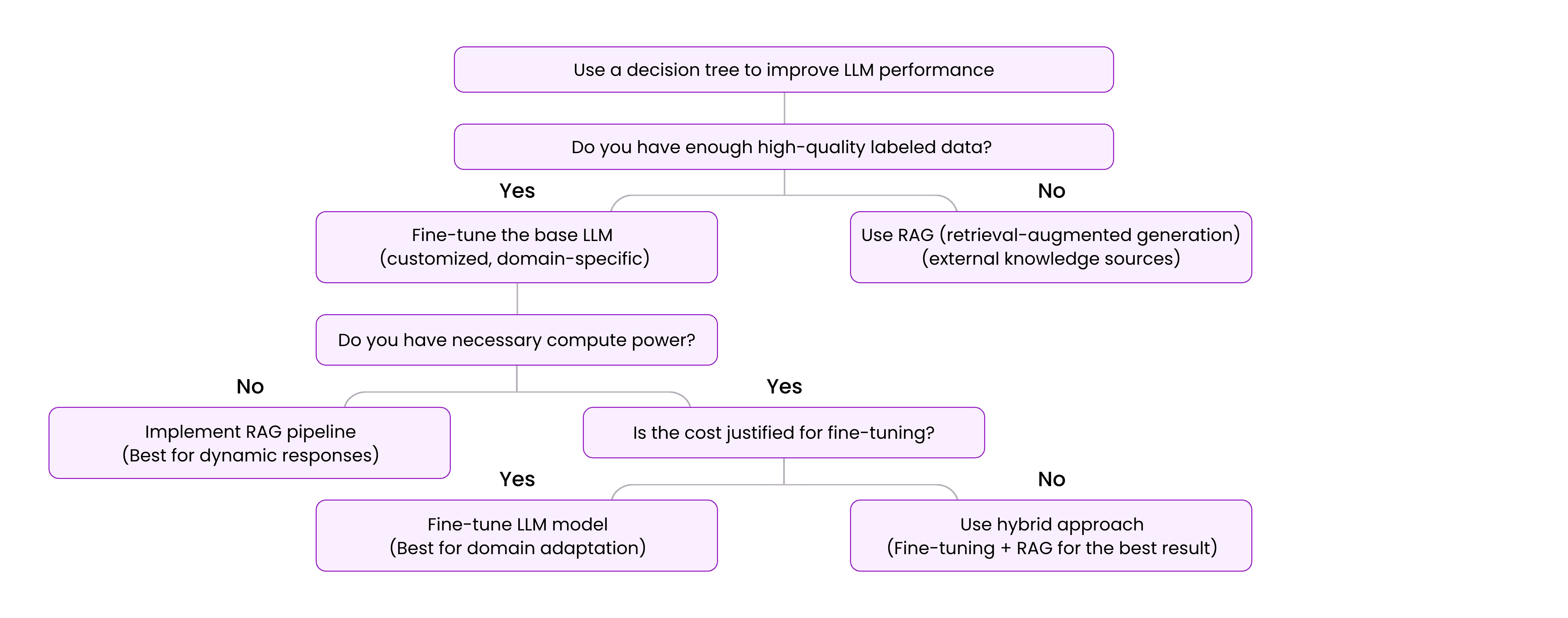 Choosing between fine-tuning a base LLM and use RAG principles is not a straightforward decision. Each approach comes with trade-offs, and the right choice depends on your specific needs, resources, and operational goals.